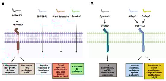 Functions of cysteine-rich and non-cysteine-rich/non-PTM peptides in plant immunity and their corresponding receptors. (A) Functions of cysteine-rich peptides in plant immunity and their corresponding receptors. (B) Functions of non-cysteine-rich/non-PTM peptides in plant immunity and their corresponding receptors.