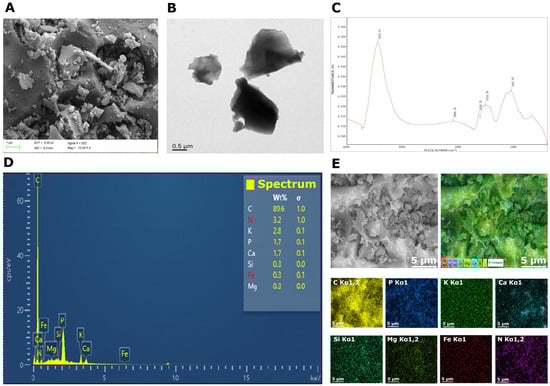 SEM (A), TEM (B), FTIR spectra of biochar (C), elements mapping (D) and EDS dispersion of biochar (E).