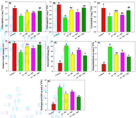 Arsenic significantly decreased leaf chlorophyll and relative water contents (RWC) (Figure 2). Arsenic toxicity inhibited chl-a, chl-b, and carotenoid synthesis by 48.12%, 92.42% and 53.22%, respectively, compared to the control (Figure 2). Compared with the control, As decreased leaf RWC by 48% (Figure 2). In contrast, the BC and MT application caused a marked increase in both photosynthetic pigments and leaf RWC (Figure 2). Leaf chl-a, chl-b, carotenoid, and RWC contents were considerably increased by 30.07%, 71.21%, 38.70%, and 40%, respectively, under As stress with co-applied BC and MT (Figure 2). BC and MT alone also significantly increased the photosynthetic pigments and RWC; however, better results were seen with co-applied BC and MT (Figure 2).