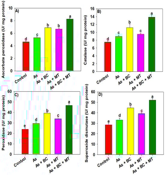 The results indicated that, compared with the control, As substantially increased oxidative markers (Figure 2). We found that As significantly increased electrolyte leakage (EL), malondialdehyde (MDA), and hydrogen peroxide (production by 206.81%, 238.25%, and 279.79%, respectively. The co-application of BC and MT, and their individual applications, significantly decreased oxidative markers; however, better results were observed with the integrative BC and MT application (Figure 1). Co-applying BC and MT decreased EL, MDA, and H2O2 production by 62.28%, 40.67%, and 75.66%, respectively, under As -polluted soil (Figure 2). The presented results depicted that antioxidant activity increased under As, indicating the plants activated their defense system to counter As toxicity. Nevertheless, combined BC and MT, as well as their individual application, also significantly increased all antioxidant activities, yet better results were observed with the combined BC and MT application (Figure 3). We witnessed an increase of 56.43%, 55.14%, 57.77%, and 57.52%, respectively, in ascorbate peroxidase (APX), catalase (CAT), peroxidase (POD), and superoxide dismutase (SOD) activities under As stress with co-applying BC and MT (Figure 3).
