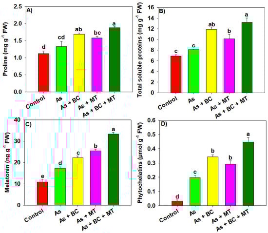 The results showed that osmolytes and endogenous MT synthesis increased under As, compared to the control, indicating the potential of rice plants to increase osmolyte and MT synthesis to counter As toxicity (Figure 4). The synthesis of total soluble proteins (TSP), proline, and MT was increased by 17.27%, 18.75%, and 63.84%, respectively. All of the amendments also substantially enhanced the synthesis of osmolytes and endogenous MT; however, better results were seen with combined BC and MT (Figure 4). The results showed an increase of 63.86%, 41.35%, and 91.53% in TSP, proline, and endogenous MT synthesis with co-applied BC and MT (Figure 4). Different treatments significantly impacted the phytochelatins (PCs) synthesis. Co-applying BC + MT enhanced PCs synthesis by 125%, while BC and MT enhanced PCs synthesis by 70% and 45%, respectively, in As polluted soil (Figure 4).