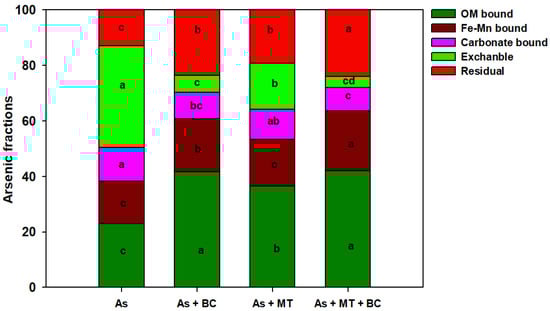 Different treatments significantly impacted the soil As fractions (Figure 4). We found that maximum exchangeable As was found in As-contaminated soil, and all the treatments significantly decreased exchangeable As availability; however, better results were seen with co-applied BC and MT. Further, we also witnessed that As significantly increased carbonate-bound As, and BC and MT decreased its availability. The results also depicted that As decreased the availability of organic matter-bound, iron and manganese (Fe-Mn)-bound, and residual As. Biochar and MT, and their co-exposure, significantly enhanced these As fractions; nevertheless, more promising results were observed with combined BC and MT application (Figure 5).