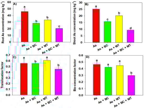 The results indicated that maximum As accumulation in roots (46 mg kg−1) and shoots (25.15 mg kg−1) was observed under As. The application of BC and MT, and their combination, significantly decreased As in both roots and shoots; however, the lowest As concentrations in roots (20.53 mg kg−1) and shoots (9.26 mg kg−1) were observed with combined BC and MT application (Figure 6). The lowest TF and BCF of As were observed with co-applying BC and MT, compared to their individual applications (Figure 6). The results indicated that As significantly decreased N, P, K, calcium (Ca), and magnesium (Mg) accumulation in rice plants. In contrast, BC and MT enhanced nutrient accumulation, and maximum N, P, K, Ca, and Mg under As stress was seen with co-applied BC and MT, compared to their individual applications (Table 3).
