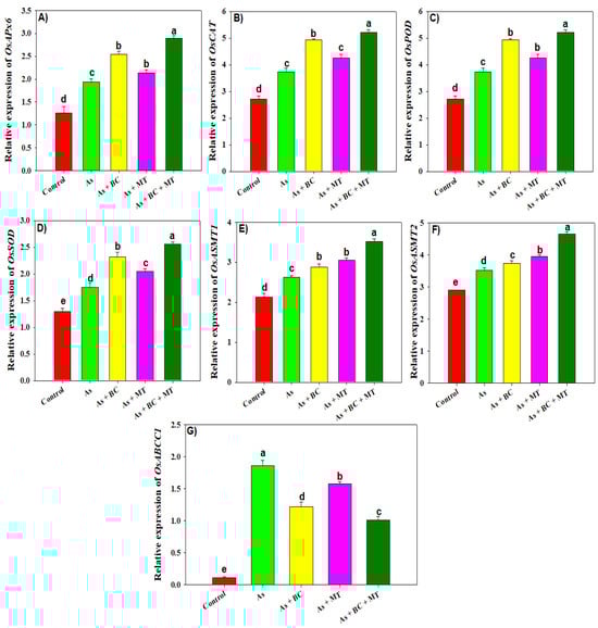 Different treatments showed a contrasting impact on the expression of antioxidant genes, MT synthesis genes, and As uptake gene expression (Figure 7). The lowest expression of all antioxidant genes was noted in the control, and under As stress, significantly enhanced expression of antioxidant genes was observed. The supplementation of BC, MT, and their co-exposure significantly enhanced gene expression (Figure 7). The co-application of BC and MT significantly enhanced OsAPx6, OsCAT, OsPOD, and OsSOD expressions by 38.46%, 48.96%, 39.30%, and 45.71%, respectively (Figure 7). We also observed that expression of OsASMT1 and OsASMT2 increased under As stress, and this was further increased with BC, MT, and their combined application. Biochar + MT increased OsASMT1 and OsASMT2 expression by 34.35% and 31.72%, respectively (Figure 7). The expression of the As uptake gene (OsABCC1) was significantly increased under As, which increased As uptake. However, BC, MT, and BC + MT significantly decreased the expression of OsABCC1 by 52.45%, 29%, and 84.15%, respectively, under As stress (Figure 7).