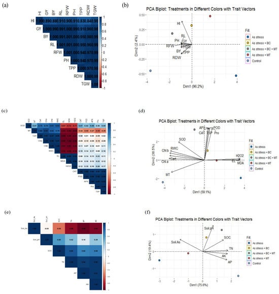 The first principal component (Dim1) accounted for 96.2% of the total variance, while the second component (Dim2) explained 2.4% (Figure 8). Arsenic stress alone clustered on the far right of the principal component analysis (PCA) space, indicating distinct trait expression patterns under stress conditions. In contrast, the control group appeared on the far left, indicating optimal trait expression in the absence of stress. Treatments involving BC and MT and their combinations (As + BC, As + MT, As +BC + MT) occupied intermediate positions, reflecting varying degrees of amelioration of stress effects (Figure 8). Trait vectors revealed that GY, BY, TPP, and TGW were the most influential contributors to Dim1, with their orientation indicating a positive association with the control and ameliorated treatments. Conversely, the As stress treatment showed a negative association with most of the measured traits, highlighting the detrimental impact of arsenic exposure on growth and yield-related parameters (Figure 8).