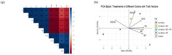 The control treatment (purple point) also exhibited a strong association with nutrient-rich vectors, confirming optimal soil conditions in the absence of arsenic stress. The PCA biplot (Figure 4B) explained 75.6% of the total variation on Dim1 and 19.4% on Dim2 for seedling nutrients accumulation. As stress + BC + MT treatment appeared on the positive side of Dim1 and aligned with nutrient vectors (TN, AK, AP, SOC), suggesting that biochar and microbial amendments not only reduced arsenic uptake but also enhanced nutrient assimilation. The control treatment also clustered favorably, reinforcing the negative impact of arsenic stress and the restorative potential of the combined treatment (Figure 8).