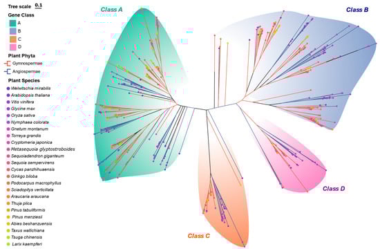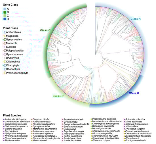 To investigate the phylogenetic evolution of the GATA gene family, we comprehensively analyzed the genomes of 50 representative early land plants and algae, encompassing bryophytes, ferns, gymnosperms, and angiosperms. We identified a total of 921 GATA genes and classified them into four major classes—Classes A, B, C, and D—based on their conserved domain features and phylogenetic relationships (Figure 1; Table S1).