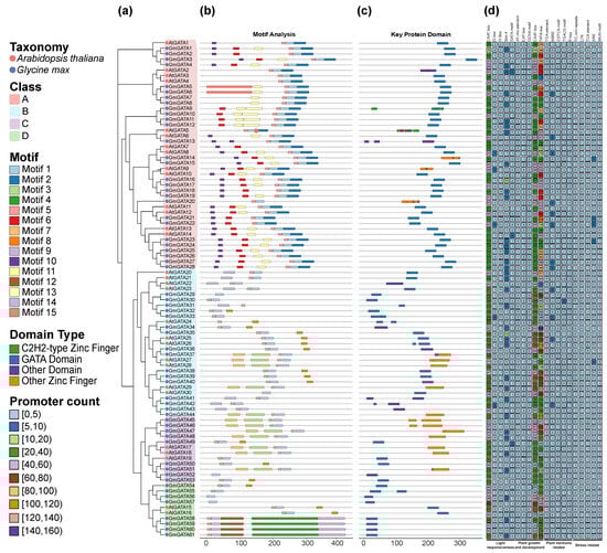 To elucidate the evolutionary relationships and functional diversification of the GATA gene family, we performed a phylogenetic analysis on GATA genes from soybean (Glycine max) and Arabidopsis thaliana (Figure 3a; Table S3). We identified a total of 61 GATA genes in soybean, comprising 28 Class A, 16 Class B, 9 Class C, and 8 Class D members. In Arabidopsis, 30 GATA genes were identified, with the majority belonging to Class A (14 genes), followed by Class B (11 genes), Class C (3 genes), and Class D (2 genes). The constructed phylogenetic tree supports the formation of well-defined clades during GATA gene evolution and demonstrates a high degree of phylogenetic conservation across different classes.