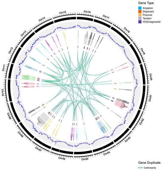 Chromosomal distribution and synteny of GATA genes in Glycine max. A Circos plot displaying genomic features of the soybean GATA gene family. Tracks are arranged from outermost to innermost: ideograms of the 20 soybean chromosomes (Chr01–Chr20); chromosomal coordinates in megabases (Mb); physical locations of GATA genes, marked by black rectangles; GATA gene density (blue line) calculated in a 500 kb sliding window; GATA gene identifiers, colored by chromosome; gene duplication event types: singleton (blue), dispersed (orange), proximal (yellow), tandem (light purple), and segmental/WGD (dark purple); and syntenic relationships between GATA genes, indicated by green lines. Duplication and synteny analyses were performed with MCScanX based on the Glycine max Wm82.a2.v1 reference genome.