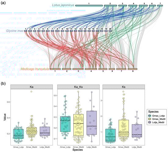 Interspecies synteny and selection pressure on GATA genes in three legume species. (a) Syntenic relationships of GATA genes between Glycine max (purple), Lotus japonicus (green), and Medicago truncatula (orange). Colored lines connect syntenic GATA gene pairs between species, while gray lines represent synteny of all other collinear genes. (b) Distribution of nonsynonymous substitution rates (Ka), synonymous substitution rates (Ks), and their ratios (Ka/Ks) for syntenic GATA gene pairs (G. max–L. japonicus, G. max–M. truncatula, and L. japonicus–M. truncatula).