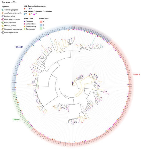 Phylogeny and expression correlation of GATA genes with NIN1 and NSP1/NSP2 in eight nitrogen-fixing species. Maximum-likelihood phylogeny of GATA proteins from Arachis hypogaea, Aeschynomene evenia, Lupinus albus, Medicago truncatula, Lotus japonicus, Mimosa pudica, Hippophae rhamnoides, and Datisca glomerata. Tree constructed with IQ-TREE using BIC-selected model (1000 bootstrap replicates; scale bar = 0.2). Genes classified into Class A (red), B (blue), or C (green) based on conserved domains. Branches are colored by species; symbols denote taxonomic groups. Pearson correlations between GATA genes and the expression levels of NIN1 and NSP1/NSP2 are indicated as follows: * p < 0.05, ** p < 0.01, *** p < 0.001.