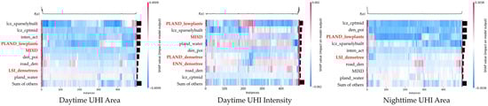The models yielded generally robust predictive outcomes (Table 5), particularly in explaining spatial thermal patterns. The daytime UHI area model achieved an R2 of 0.76 and an RMSE of 1.43 km2, demonstrating strong explanatory capacity. The nighttime UHI area model followed with an R2 of 0.58, while the daytime UHI intensity model showed moderate performance (R2 = 0.37), likely reflecting the greater influence of transient microclimatic factors such as solar exposure and shading dynamics on thermal intensity compared to spatial extent.