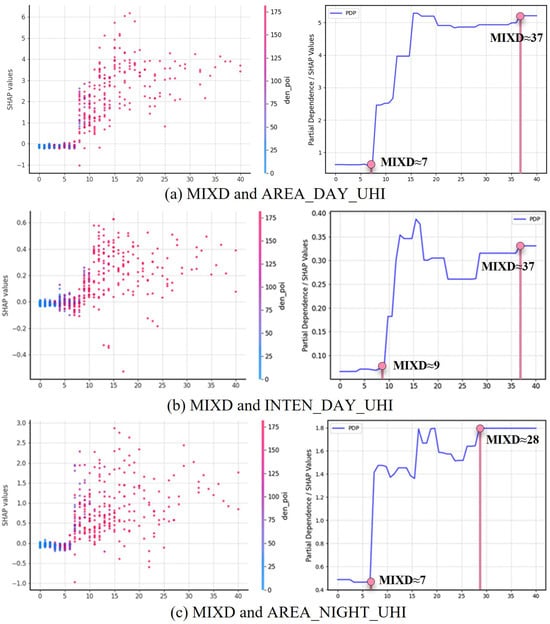 Building on the identification of the most relevant predictors for UHI mitigation in Section 2.3.1, this section further investigates the nonlinear relationships between MIXD and UHI mitigation outcomes, with a specific focus on how varying levels of land-use compactness influence the cooling effects of vegetation. Drawing from the prior moderation analyses, which indicated strong interactive effects of MIXD on three thermal metrics—daytime UHI area, nighttime UHI area, and daytime UHI intensity—three XGBoost models were constructed to assess the nonlinear influence of MIXD under different vegetation configurations. Partial dependence plots (PDPs) derived from SHAP analysis reveal distinct threshold behaviors across all three target outcomes (Figure 2).
