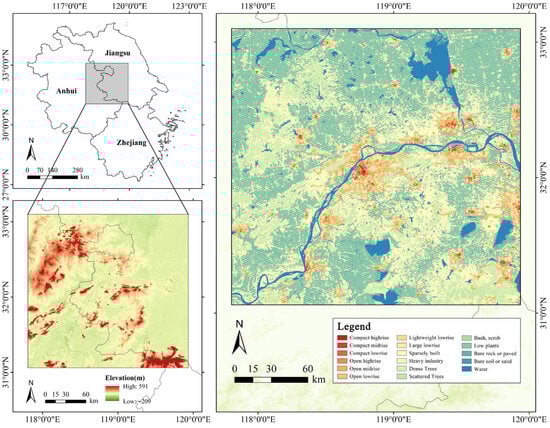 This study was conducted in Nanjing and its surrounding metropolitan region, located in Jiangsu Province, eastern China. As a core city within the Yangtze River Delta urban agglomeration, Nanjing has undergone rapid urbanization in recent decades, resulting in a typical pattern of compact, high-density development [33]. The region experiences a humid subtropical climate with hot summers and exhibits a pronounced UHI effect, making it a representative case for investigating the thermal modulation capacity of urban vegetation under intensifying land-use compactness [34]. Despite ongoing densification, Nanjing retains a relatively rich green infrastructure network, including large public parks, street-level greenery, and residential plantings. This co-occurrence of urban density and ecological assets provides a unique context for examining how different vegetation types interact with compact urban form to influence UHI dynamics.