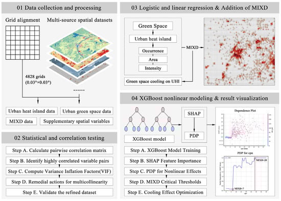 The process begins with the collection and preprocessing of multi-source urban datasets, including remote sensing imagery, POI-based land-use indicators, and urban climate classifications. All data were spatially aligned through rasterization and grid-based standardization to ensure consistency across analytical units. To understand the underlying structure of the variables, descriptive statistics and multicollinearity checks were conducted prior to modeling. Logistic regression models were then used to estimate the likelihood of UHI occurrence, while linear regression was applied to examine how green space characteristics influenced the spatial extent and thermal intensity of UHI. These statistical models established a foundational understanding of the associations between vegetation configuration and urban thermal environments. Building upon this baseline, interaction terms between green space metrics and MIXD were incorporated into the regression framework to assess how the effects of vegetation vary under different levels of land-use compactness. This allowed the study to evaluate not just whether green infrastructure cools the urban environment, but also under what conditions such cooling is amplified or constrained. To further capture nonlinear dynamics, the study employed the XGBoost algorithm, which is particularly suited to high-dimensional and interaction-rich data. SHapley Additive exPlanations (SHAP) were used to interpret variable contributions and identify key predictors, while Partial Dependence Plots (PDPs) helped visualize threshold effects—particularly where shifts in MIXD altered the effectiveness of green space interventions.