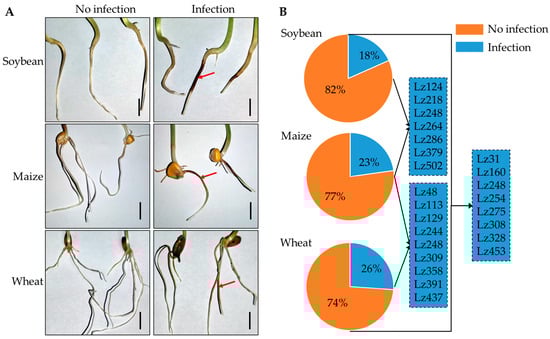 To assess the cross-host infection potential of FHB pathogens, 180 Fusarium strains were co-inoculated with the root systems of wheat, maize, and soybean (strain details in Table S1). Pathogenicity assays demonstrated successful infection of all three crop roots by FHB pathogens (Figure 1A). Quantitative analysis revealed host-specific infection frequencies: 18% of strains infected soybean roots; 23% colonized maize roots; and 26% exhibited virulence toward wheat roots (Figure 1B; Table S1). Notably, seven strains showed dual infectivity on soybean and maize, nine strains infected both maize and wheat, and eight strains were pathogenic to wheat and soybean. Strikingly, strain Lz248 displayed tripartite infectivity across all three hosts. These results confirm that FHB pathogens can induce soil-borne root diseases in wheat, maize, and soybean, with individual strains capable of infecting multiple hosts.