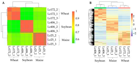 To investigate the transcriptional mechanisms underlying multi-host infectivity, RNA sequencing was conducted on the roots of wheat, maize, and soybean infected by F. graminearum strains Lz172 (wheat-specific), Lz25 (maize-specific), and Lz406 (soybean-specific) (Table S3). These three strains had the same growth rates and phenotypes [6]. Correlation analysis revealed no significant associations (r < 0.3, p > 0.05) between the transcriptomes of these strains during host colonization (Figure 2A). Hierarchical clustering further demonstrated divergent gene expression profiles among strains adapted to different hosts (Figure 2B). These findings indicate that host-specific gene expression reprogramming governs the adaptation of F. graminearum to the roots of wheat, maize, and soybean.