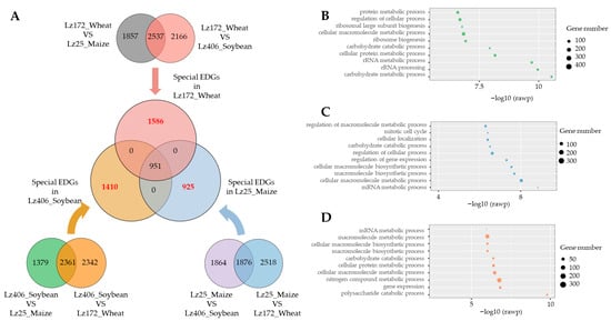 To elucidate host-adaptive gene expression patterns, we identified differentially expressed genes (DEGs) in F. graminearum during wheat, maize, and soybean root infections using variance analysis. Strain-specific induction was observed: 1586 DEGs were upregulated during wheat root colonization, 1410 during soybean infection, and 925 during maize pathogenesis (Figure 3A; Table S4). Critically, GO enrichment exposed host-tailored metabolic exploitation: During wheat infection, DEGs enriched in protein metabolic processes and ribosomal large subunit biogenesis suggest accelerated protein synthesis to support invasive growth (Figure 3B). In soybean, DEGs linked to mitotic cell cycle regulation and carbohydrate catabolism indicate enhanced proliferation and carbon utilization from legume-specific substrates (Figure 3C). For maize, DEGs governing mRNA metabolism and cellular macromolecule biosynthesis reflect adaptations to cereal root exudates, potentially enabling amino acid auxotrophy (Figure 3D). These findings demonstrate that F. graminearum dynamically modulates its transcriptional landscape to exploit host-specific metabolic niches during root infection.