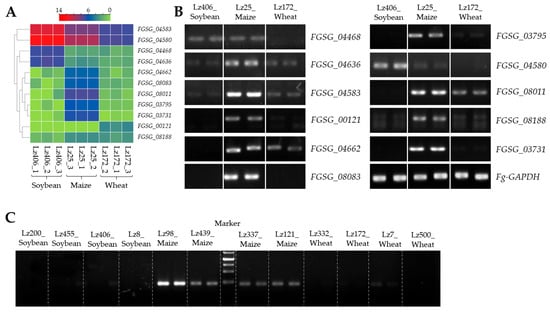 Molecular validation of host-specific virulence genes. (A) Heatmap analysis of DEGs identified by RNA-seq during infection of wheat (Lz172), maize (Lz25), and soybean (Lz406) roots. (B) RT-qPCR confirmation of host-restricted gene expression. Electropherograms show amplicons for target genes in wheat (Lz172), maize (Lz25), and soybean (Lz406) infections. FgGAPDH served as the endogenous control. (C) RT-PCR detection of FgPPDT1 expression across 12 Fusarium strains infecting wheat, maize, and soybean roots. All PCR products were verified by sequencing. Data represent two biological replicates per treatment.