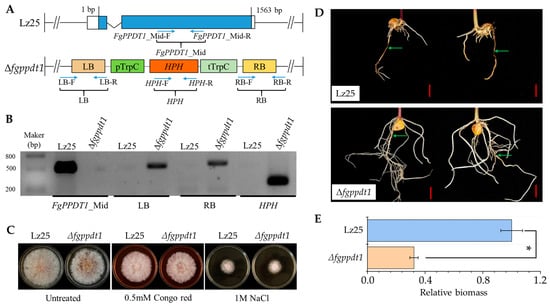 Functional characterization of FgPPDT1 in maize pathogenesis. (A) Schematic representation of the FgPPDT1 gene structure and validation primer locations (blue arrows) in wild-type strain Lz25 and FgPPDT1 knockout mutant (Δfgppdt1) mutant. (B) PCR verification of ∆fgppdt1 mutants using primers depicted in (A). All primers were listed in Table S2. All PCR products were verified by sequencing. (C) Mycelial growth phenotypes of Lz25 and ∆fgppdt1 strains on PDA plates supplemented with 0.5 mM Congo red or 1 M NaCl at 5 days post-inoculation (dpi). CK: Untreated control. Three biological replicates per treatment. (D) Pathogenicity assessment of maize roots inoculated with Lz25 and ∆fgppdt1 strains at 8 dpi. Necrotic lesions are indicated by green arrows. Scale bar = 1 cm. 5 biological replicates per treatment. (E) Quantitative analysis of fungal biomass in maize roots colonized by Lz25 and ∆fgppdt1 strains at 8 dpi. Data represent mean ± SD from three biological replicates. Asterisks (*) denote statistically significant differences (Student’s t-test, * p ≤ 0.05).