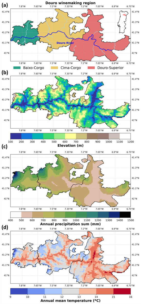 Several studies have investigated these issues across various wine-producing regions, such as the Bordeaux region in France [20], the Napa Valley in the United States [21], and the Barossa in Australia [22]. However, most of these studies still rely on the former Representative Concentration Pathways (RCPs) [23]. Furthermore, these approaches usually rely on climate data at relatively coarse spatial resolutions (typically 12.5 km), which may not adequately capture the complex topography and intricate microclimates characteristic of regions like the DWR, where sharp gradients in elevation, slope, and solar exposure strongly influence vine development and grape quality. In contrast, our study leverages a very high-resolution, state-of-the-art ensemble of climate models based on the latest Shared Socioeconomic Pathways (SSPs) [24,25], allowing for more precise simulations of local climate variability and its impact on viticulture. This enhanced resolution and updated scenario framework provide a more robust basis for assessing the impact of climate change on Douro vineyards.