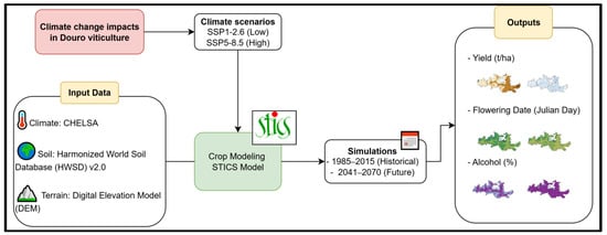 The current study applies a comprehensive ensemble of state-of-the-art climate models, coupled with the STICS dynamic crop model, to assess the future impacts of climate change on three key factors influencing viticulture in the Douro region: yield, alcohol content, and phenological development (Figure 2). By integrating high-resolution climate projections with detailed physiological crop responses, this study provides robust, region-specific projections of grapevine performance. It considers two contrasting socio-economic climate scenarios, SSP1-2.6 and SSP5-8.5, which together represent a wide range of plausible future conditions. This scenario-based approach enables a detailed evaluation of how changes in temperature, precipitation, and extreme weather events may affect grape development and wine quality. The novelty of the study lies in its coupling of fine-scale climate modelling with a crop-specific simulation framework applied to a globally recognized wine region. The results are intended to inform adaptive management strategies and support sustainable policy-making to enhance the resilience of Douro wine production under climate change. The objectives of this study are as follows: (1) to quantify the potential effects of future climate change on grapevine yield, phenology, and grape composition in the Douro region; (2) to assess how these impacts may differ under low- and high-emissions scenarios; and (3) to provide model-based insights that support adaptive management strategies and sustainable policy-making aimed at ensuring the long-term resilience of Douro wine production.