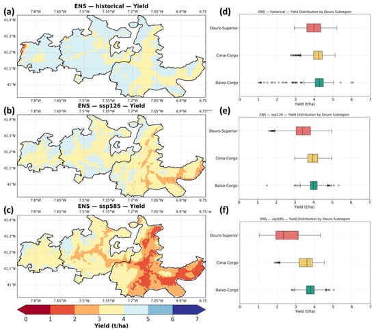 Figure 3d–f present the distribution of simulated yields for each of the three Douro subregions. Historically, Baixo-Corgo exhibits the highest median yield, followed by Cima-Corgo and Douro-Superior. This regional pattern persists under SSP1–2.6 but with slightly reduced medians. Under SSP5–8.5, all subregions experience a marked decline in yield, with Douro-Superior showing the largest increase in interquartile range, suggesting both a drop in productivity and increased spatial variability. Outliers are more frequent under historical and SSP1–2.6 conditions, indicating greater local heterogeneity in yield, whereas under SSP5–8.5, yields become more uniformly suppressed across the regions.