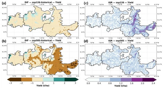 Panels (c) and (d) display the interquartile range of ensemble yield projections under SSP1–2.6 and SSP5–8.5, respectively. Under SSP1–2.6 (panel c), model spread remains moderate, with IQR values mostly below 1 t/ha but with some localized uncertainty hotspots (1.5–2.4 t/ha) along eastern slopes of Douro Superior. Under SSP5–8.5 (panel d), ensemble uncertainty becomes more spatially widespread but remains within similar magnitudes, suggesting consistent model agreement on the direction of change, particularly in areas with the greatest projected losses.
