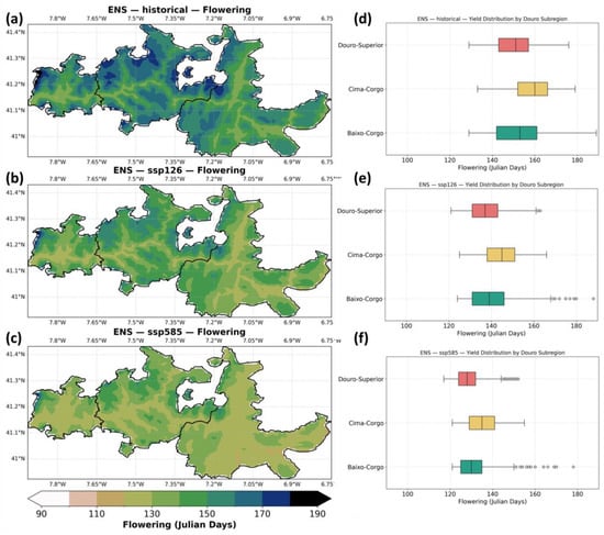 Figure 5 shows the ensemble median projections for grapevine flowering dates. In the historical period (panel a), flowering generally occurs from mid-May to early June (Julian days 140–160), with earlier flowering in the warmer eastern areas of Douro-Superior and later flowering in the cooler and moister Baixo-Corgo. Under SSP1–2.6 (panel b), flowering is projected to advance by approximately one to two weeks, occurring mostly between early and late May (Julian days 130–150). The shift is stronger under SSP5–8.5 (panel c), where flowering occurs as early as mid-April to mid-May (Julian days 120–140), especially near the river valleys (low elevation zones). Figure 5d–f summarize these changes by subregion. In the baseline (panel d), median flowering occurs in late May in Douro-Superior, slightly later in Cima-Corgo, and around early June in Baixo-Corgo. Under SSP1–2.6 (panel e), all three subregions show earlier flowering by about one week. Under SSP5–8.5 (panel f), flowering advances by up to two weeks, reaching mid-May in Douro Superior, shifting to mid-to-late May in Cima Corgo, and to late May in Baixo Corgo.