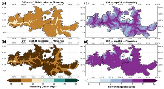 Figure 6 shows the difference between future scenarios and the historical baseline, along with the ensemble uncertainty (IQR). Differences between scenarios are particularly significant, while in SSP1–2.6 the advance of flowering may reach up to -20 days, in SSP5–8.5 the advance will reach up to one month. Regarding the model agreement, in SSP5–8.5, IQR tends to be relatively high in all areas (up to 12 days), whereas, in SSP1–2.6, the areas closer to the river, tend to show higher values of ensemble uncertainty, with the rest of Douro showing low IQR values (<4 days).