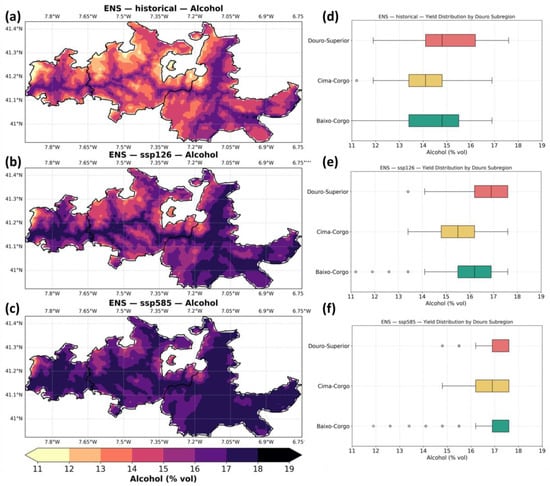 The subregional boxplots (panels d–f) confirm these spatial patterns. Historically (panel d), median alcohol content is around 15.5% in Douro-Superior, 14.5% in Cima-Corgo, and just under 14% in Baixo-Corgo. Future projections under SSP1–2.6 (panel e) indicate increases of approximately 1% across all subregions, with Douro-Superior reaching medians near 16.5%. Under SSP5–8.5 (panel f), alcohol content increases further, with medians exceeding 17% in Douro-Superior and reaching 15–16% in Baixo-Corgo.