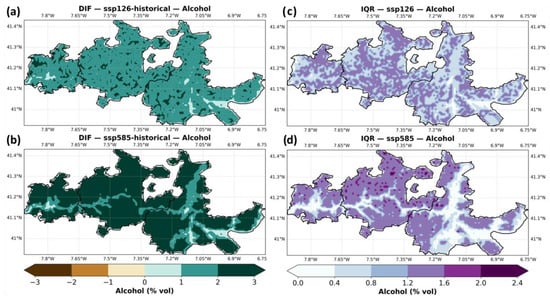 Figure 8a summarizes the aforementioned changes. Under SSP1–2.6 (panel a), alcohol content is projected to increase moderately across most of the Douro region, with widespread gains between +0.5% and +1.5% vol. In SSP5–8.5 (panel b), these increases become more pronounced, especially at higher elevations in the south-eastern areas, where changes often exceed +2% vol. The largest alcohol gains under SSP5–8.5 occur in Douro-Superior, but meaningful increases are evident even in Baixo-Corgo.