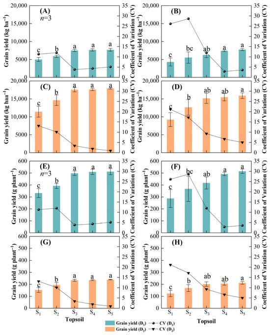 Grain yield and coefficient of variation (CV) at different maize densities and topsoil depths in 2021 and 2022. (A–D) are the maize yield per unit area and (E–H) are the maize yield per plant. Grain yield and coefficient of variation at a maize density of 15,000 plants ha−1 (D1) in (A) 2021 and (B) 2022 and at a maize density of 75,000 plants ha−1 (D2) in (C) 2021 and (D) 2022. Topsoil depth: S1, 10 cm; S2, 20 cm; S3, 30 cm; S4, 40 cm; and S5, 50 cm. Values are the mean ± SD. Different lowercase letters above the bars for different treatments indicate significant differences at p < 0.05, according to LSD analysis.