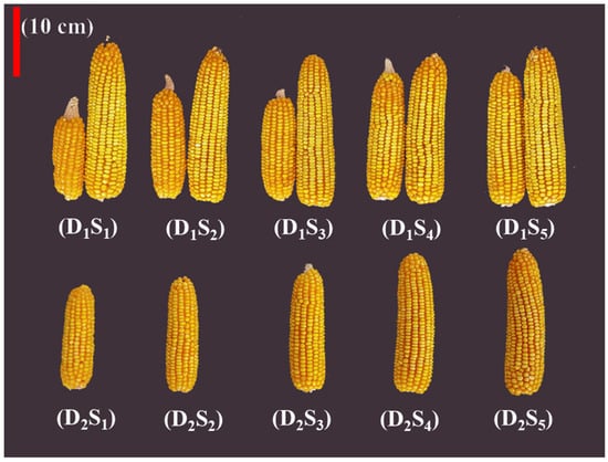 Maize cob characteristics at different maize densities and topsoil depths. Maize density: D1, 15,000 plants ha−1; D2, 75,000 plants ha−1. Topsoil depth: S1, 10 cm; S2, 20 cm; S3, 30 cm; S4, 40 cm; and S5, 50 cm.