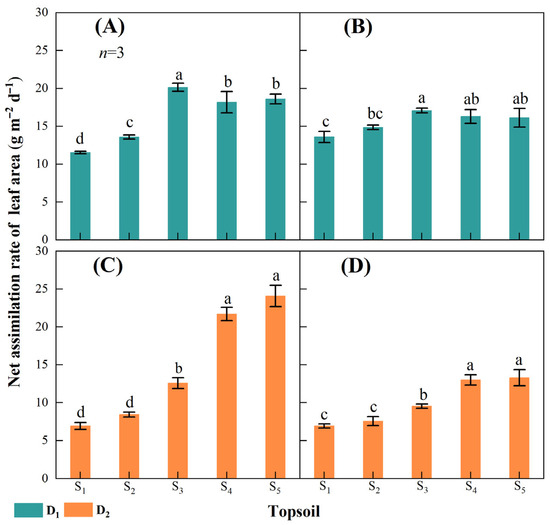 Net assimilation rate of leaf area at different maize densities and topsoil depths in 2021 and 2022. Net assimilation rate of leaf area at the maize density of 15,000 plants ha−1 (D1) in (A) 2021 and (B) 2022 and at the maize density of 75,000 plants ha−1 (D2) in (C) 2021 and (D) 2022. Topsoil depth: S1, 10 cm; S2, 20 cm; S3, 30 cm; S4, 40 cm; and S5, 50 cm. Values are the mean ± SD. Different lowercase letters above the bars for different treatments indicate significant differences at p < 0.05, according to LSD analysis.