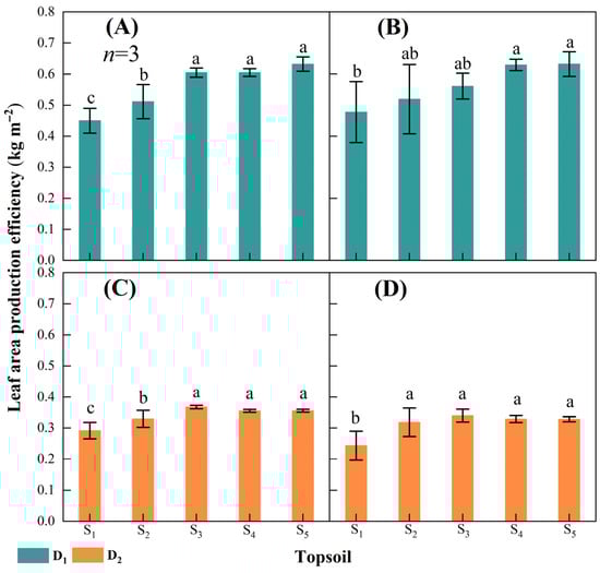 Leaf area production efficiency at different maize densities and topsoil depths in 2021 and 2022. Leaf area production efficiency at a maize density of 15,000 plants ha−1 (D1) in (A) 2021 and (B) 2022 and at a maize density of 75,000 plants ha−1 (D2) in (C) 2021 and (D) 2022. Topsoil depth: S1, 10 cm; S2, 20 cm; S3, 30 cm; S4, 40 cm; and S5, 50 cm. Values are the mean ± SD. Different lowercase letters above the bars for different treatments indicate significant differences at p < 0.05, according to LSD analysis.