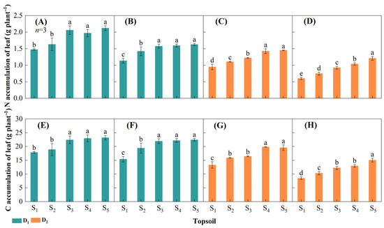 Over the two-year study, decreasing topsoil depth significantly reduced plant leaf N and C accumulation (Figure 5). In D1, leaf N accumulation in S3, S4, and S5 was significantly greater than those in S1 and S2 in both years. The lowest values were in S1 and the highest were in S5, and the maximum decrease with decreasing topsoil depth was 30.6% in 2021 and 30.1% in 2022 (Figure 5A,B). In D2, leaf N accumulation in S2, S3, S4, and S5 was significantly greater than that in S1. The highest values were in S5 in both years, and the maximum reduction with decreasing topsoil depth was 34.5% in 2021 and 50.4% in 2022 (Figure 5C,D). The results for leaf C accumulation are similar to those for N accumulation. In D1, the lowest values were in S1 and the highest were in S5, and the maximum decrease was 23.1% in 2021 and 31.4% in 2022 (Figure 5E,F). In D2, the maximum decrease in leaf C accumulation was 32.9% in 2021 and 43.4% in 2022 (Figure 5G,H).