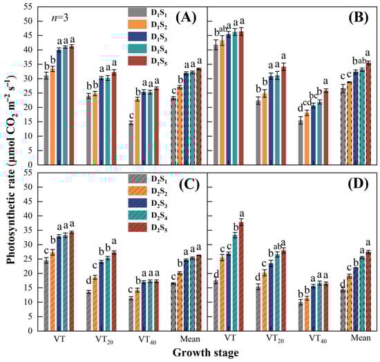 Photosynthesis rate of cob leaf at different maize densities and topsoil depths in 2021 and 2022. Stage-specific and average photosynthesis rate of cob leaf at 15,000 plants ha−1 (D1) in (A) 2021 and (B) 2022 and at 75,000 plants ha−1 (D2) in (C) 2021 and (D) 2022. VT, VT20, and VT40 are the tassel stage, 20 d after the tassel stage, and 40 d after the tassel stage, respectively, and the mean is the average of the three stages. Topsoil depth: S1, 10 cm; S2, 20 cm; S3, 30 cm; S4, 40 cm; and S5, 50 cm. Values are the mean ± SD. Different lowercase letters above the bars for different treatments indicate significant differences at p < 0.05, according to LSD analysis.