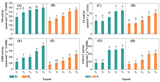 Reductions in topsoil depth significantly reduced NR, GS, GOGAT, and GDH activities in maize leaf at VT. NR, GS, GOGAT, and GDH activities decreased with decreasing topsoil depth, with the lowest values in S1 and the highest in S5 in all cases (Figure 7). The maximum decrease in NR activity was 35.7% in D1 and 45.3% in D2 (Figure 7A,B); the maximum decrease in GS activity was 43.6% in D1 and 49.8% in D2 (Figure 7C,D); the maximum decrease in GDH activity was 67.8% in D1 and 69.0% in D2 (Figure 7E,F); and the maximum decrease in GOGAT activity was 69.0% in D1 and 66.3% in D2 (Figure 7G,H).