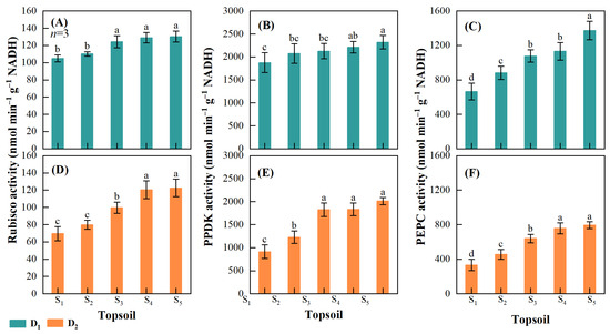Topsoil shallowing impaired Rubisco, PPDK, and PEPC activities in maize leaf at VT. The minimum and maximum Rubisco, PPDK, and PEPC activities in D1 and D2 were in S1 and S5, respectively. In D1, the maximum decreases in activity were 24.2% for Rubisco, 23.7% for PPDK, and 106.5% for PEPC (Figure 8A–C), while in D2, the maximum decreases in activity were 76.3% for Rubisco, 120.3% for PPDK, and 138.2% for PEPC (Figure 8D–F).