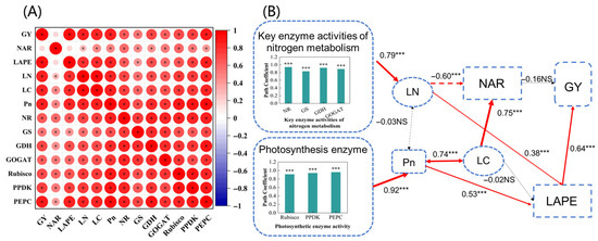 SEMs (Figure 9B) indicated that key nitrogen metabolism and photosynthesis enzymes, LN, LC, Pn, and LAPE had direct or indirect effects on grain yield (GY) (p < 0.001). The LAPE directly influenced yield, whereas other physiological and biochemical indices had an indirect influence on yield. The key N metabolism enzymes directly affected LN, and the photosynthetic enzymes directly affected Pn. The LN and Pn directly affected LAPE and thus GY, and there was a positive interaction between Pn and LC.