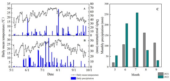 Daily mean temperature and daily precipitation in (A) 2021 and (B) 2022 and (C) monthly precipitation during maize growth in 2021 and 2022 at the study site in Jilin Province, China.