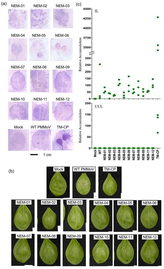 Identification of NEMs. (a) N. sylvestris leaves were toothpick-inoculated with Agrobacterium clones harboring PMMoV with a mutated CP gene. The inoculated leaves were observed at 7 days post-inoculation (dpi), and those without necrotic spots were analyzed using a hammer blot immunoassay. The 1 cm bar applies to all photos in (a,b). (b) N. sylvestris leaves were surface-inoculated with the same Agrobacterium clones using carborundum and photographed at 7 dpi. (c) RNA was extracted from the surface-inoculated leaves (IL) and uninoculated upper leaves (UUL) of N. sylvestris at 9 dpi and 20 dpi, respectively. PMMoV spread was evaluated using quantitative RT-PCR.