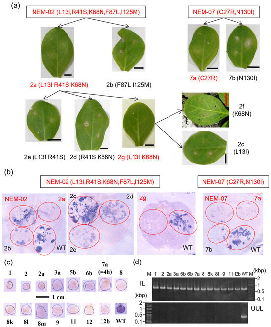 Identification of minimally required mutations in NEMs and their effects on pepper pathogenesis. (a) Evaluation of the N′-escaping phenotype. N. sylvestris leaves were toothpick-inoculated with Agrobacterium clones harboring PMMoV NEM derivative constructs and photographed at 7 dpi. The representative results for NEM-02 and -07 are shown. Derivatives were named with the NEM’s number plus an alphabet. The entire list of NEMs’ derivatives is presented in Supplementary Table S1. The bars in each panel denote 1 cm. (b) Evaluation of virus accumulation. Wild type (WT), NEMs, and their derivatives were agroinfiltrated into N. benthamiana leaves, and virus accumulation was evaluated using a hammer blot immunoassay. NEMs and their derivatives that escaped N′-mediated resistance are indicated in red. (c,d) Selected NEMs and derivatives were inoculated onto a PMMoV-susceptible pepper cultivar (Capsicum annuum cv. Shosuke) and analyzed by stem blot (c) and RT-PCR (d) of RNA from inoculated (IL) and uninoculated upper leaves (UUL).