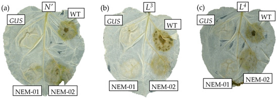 Evaluation of NEMs in the activation of L3- and L4-mediated resistance responses. N. benthamiana leaves were agroinfiltrated with wild-type (WT), GUS-expressing (control), and NEM constructs in combination with expression constructs of N′ (a), L3 (b), and L4 (c). Leaves were harvested 9 days post-infiltration, decolorized with ethanol, and photographed.