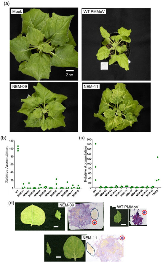 The following supporting information can be downloaded at https://www.mdpi.com/article/10.3390/plants14162471/s1, Supplementary Figure S1. Nucleotide sequence alignment of NEMs; Supplementary Figure S2. Amino acid sequence alignment of NEMs; Supplementary Figure S3. Hammer blot immunoassay of PMMoV CP; Supplementary Figure S4. Hammer blot immunoassay of the inoculated and uninoculated upper leaves of pepper (Capsicum annuum cv. Shosuke) plants infected with selected NEMs and their derivatives; Supplementary Figure S5. Hypersensitive reaction (HR) in N. benthamiana leaves co-expressed with resistance genes and NEMs; Supplementary Figure S6. Characterization of NEMs in agroinfiltrated N. benthamiana; Supplementary Figure S7. Systemic infection of N. benthamiana with NEMs; Supplementary Figure S8. Age-dependent accumulation of NEMs in systemically infected N. benthamiana; Supplementary Figure S9. Effect of salicylate hydroxylase gene expression on the accumulation of NEMs in agroinfiltrated N. benthamiana leaves; Supplementary Figure S10. Effect of salicylic acid signaling inhibitor on the accumulation of NEMs in agroinfiltrated N. benthamiana leaves; Supplementary Figure S11. Effect of proteasome or autophagy inhibitors on the accumulation of NEMs in agroinfiltrated N. benthamiana leaves; Supplementary Table S1. Summary of analyses of NEMs and their derivatives; Supplementary Table S2. Primers used in this study.