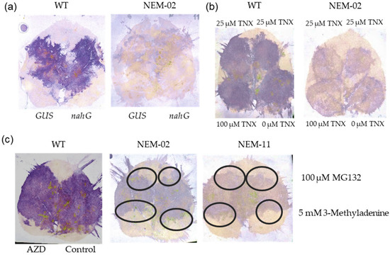 Search for the cause of low accumulation of NEMs in agroinfiltrated N. benthamiana. Virus accumulation was evaluated using a hammer blot immunoassay. (a) Effect of nahG expression on virus accumulation. A construct expressing the GUS gene was used as a control. The agrobacterium clones were infiltrated 2 days before agroinfiltration with wild-type (WT) PMMoV or NEM-02. (b) Effect of TNX on virus accumulation. The indicated concentrations of TNX were added to bacterial suspensions for WT and NEM-02 agroinfiltration. (c) Effect of proteasome inhibitor (MG132) and autophagy inhibitor (3-Methyladenine) on virus accumulation in NEMs. WT was co-agroinfiltrated with the autophagy inducer, AZD-8055. The areas infiltrated with the inhibitors are denoted by black circles.