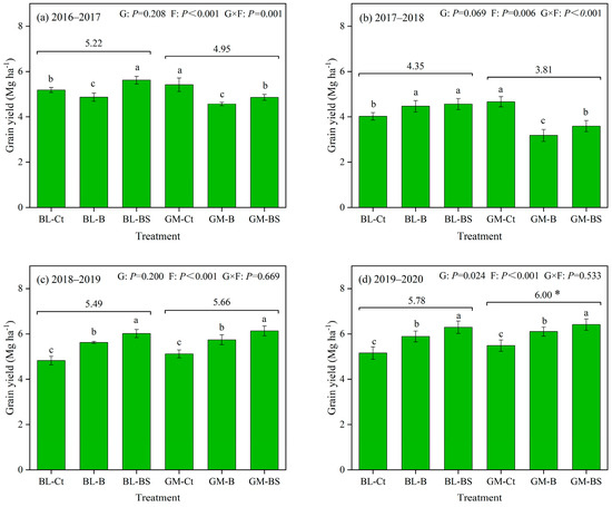 Grain yield of the winter wheat as affected by planting regime (G) and fertilization treatment (F) during the four wheat seasons: 2016–2017 (a), 2017–2018 (b), 2018–2019 (c) and 2019–2020 (d). Ct, B, and BS represent the control (no fertilization), basal fertilization with NPK fertilizers, and basal fertilization plus wheat straw return, respectively. GM represents planting GM and incorporation during summer fallow before the wheat season, compared with conventional wheat cultivation after a bare land fallow (BL). Two-way (G and F) ANOVA and a LSD test were used for each year to determine the significances among treatments. Filled boxes indicate the mean values with their standard errors as error bars (mean ± SE; n = 3). * indicates a significant difference (p < 0.05) between the two main treatments affected by G. Different lower-case letters indicate significant differences (p < 0.05) between the three fertilization patterns.