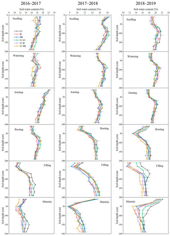 Soil water content in the upper 0–200 cm layer at different growing stages of winter wheat among treatments across 2016–2017, 2017–2018, and 2018–2019. Ct, B, and BS represent the control (no fertilization), basal fertilization with NPK fertilizers, and basal fertilization plus wheat straw return, respectively. GM represents planting GM and incorporation during summer fallow before the wheat season, compared with conventional wheat cultivation after a bare land fallow (BL). Data are shown as the means with the standard errors (mean ± SE; n = 3).