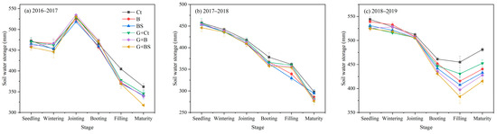 Soil water storage in the 0–200 cm soil layer during the winter wheat growing seasons of 2016–2017 (a), 2017–2018 (b), and 2018–2019 (c). Ct, B, and BS represent the control (no fertilization), basal fertilization with NPK fertilizers, and basal fertilization plus wheat straw return, respectively. GM represents planting GM and incorporation during summer fallow before the wheat season, compared with conventional wheat cultivation after a bare land fallow (BL). Data are shown as the means with the standard errors (mean ± SE; n = 3).
